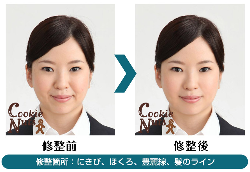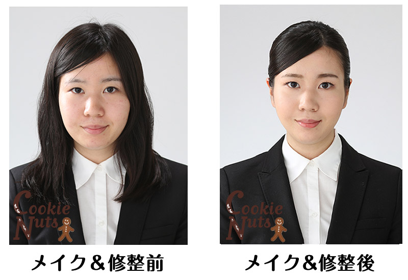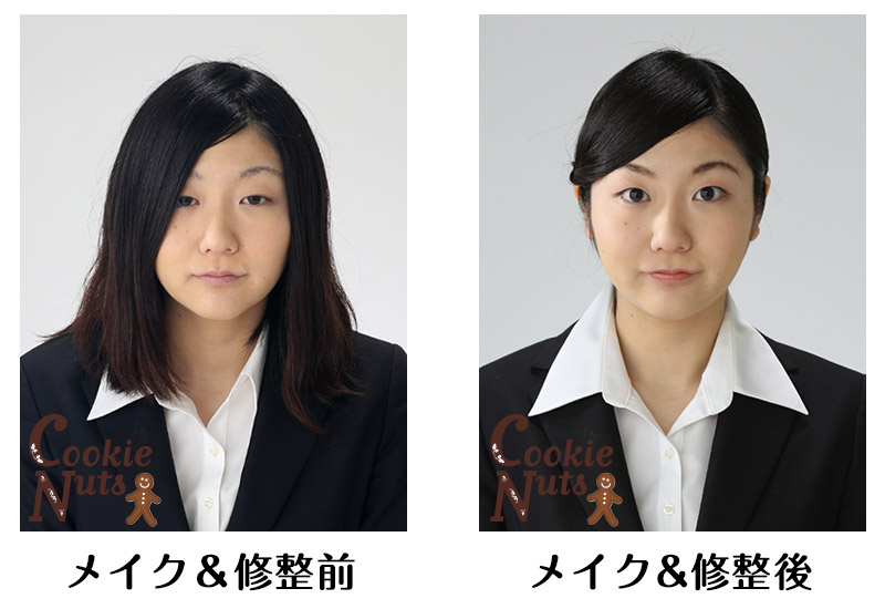 ヘアメイク(ヘアセット+ポイントメイク)・カウンセリング・プロによる撮影を行なった後、さらにいい印象の証明写真にすべく修整を行います。 クッキーナッツの修整は、その人の良さがしっかり引き立つように 自然な修整を心がけています。修整を行うことで写真は完成し、100%の自信を持って提出できる証明写真となります。 ※「目の下のクマを消す」などのポイント修整も承ります(有料:550円)
