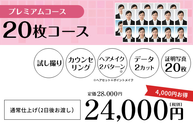 髪型や襟元など用途に応じた2パターンを撮影したおすすめコースです